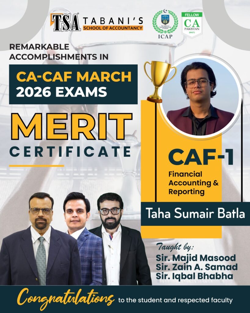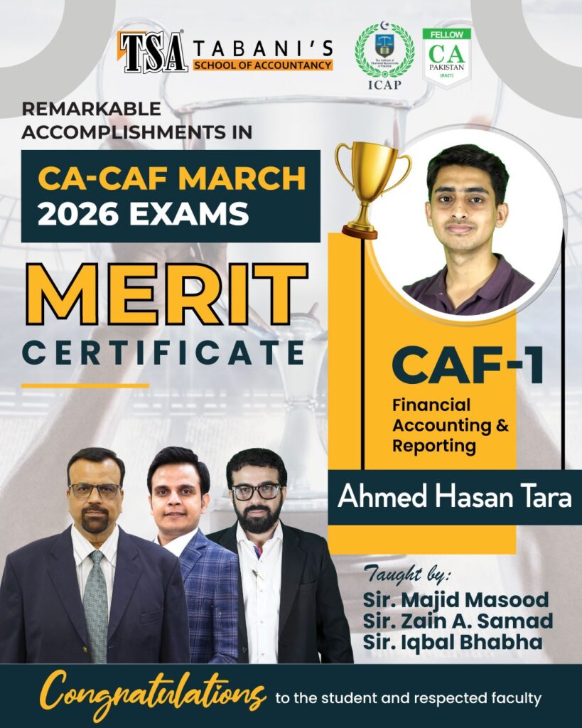 Our students have once again proven their excellence by securing Merit Certificates in CAF-1 (Financial Accounting & Reporting), reflecting TSA’s commitment to quality education and academic success.